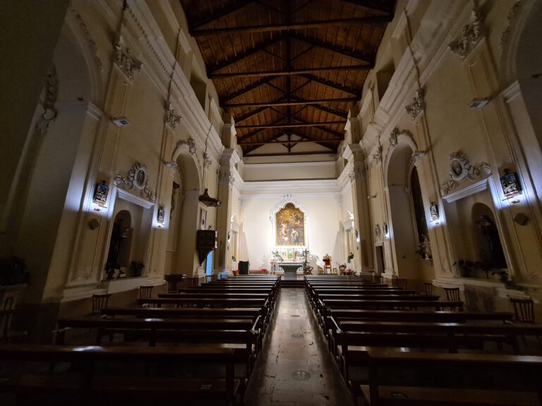 La Chiesa si sviluppa su una pianta longitudinale di forma rettangolare ai cui lati sono annessi i locali della Sagrestia ad Ovest e quelli della Canonica ad Est. Essa presenta un’unica navata in cui a conclusione del presbiterio si trova l’altare centrale. Questo luogo è leggermente rialzato da due gradini e fino all’ultimo restauro avvenuto nel 2006 era separato dai banchi da una balaustra in marmo che è stata tolta per “avvicinare” il celebrante ai fedeli. Sempre all’interno del presbiterio è presente l’ambone e lo spazio per accogliere la corale parrocchiale. E’ presente un fonte battesimale di pregio artistico che si è conservato negli anni nella parte sinistra della navata, esattamente sotto il Crocifisso, all’ingresso sono invece presenti le due acquasantiere in marmo con corrispondente piedistallo, in corrispondenza delle quali sono presenti le due porte antiche che danno accesso al campanile e al loggiato predisposto per il coro. Nelle pareti laterali sono predisposti in maniera simmetrica otto cappelle, due delle quali si trovano nel presbiterio e in corrispondenza di alcune di esse sono presenti dei pregevoli affreschi di epoca settecentesca, oltre che le statue dei vari santi che hanno, ciascuno, la loro “storia”.
