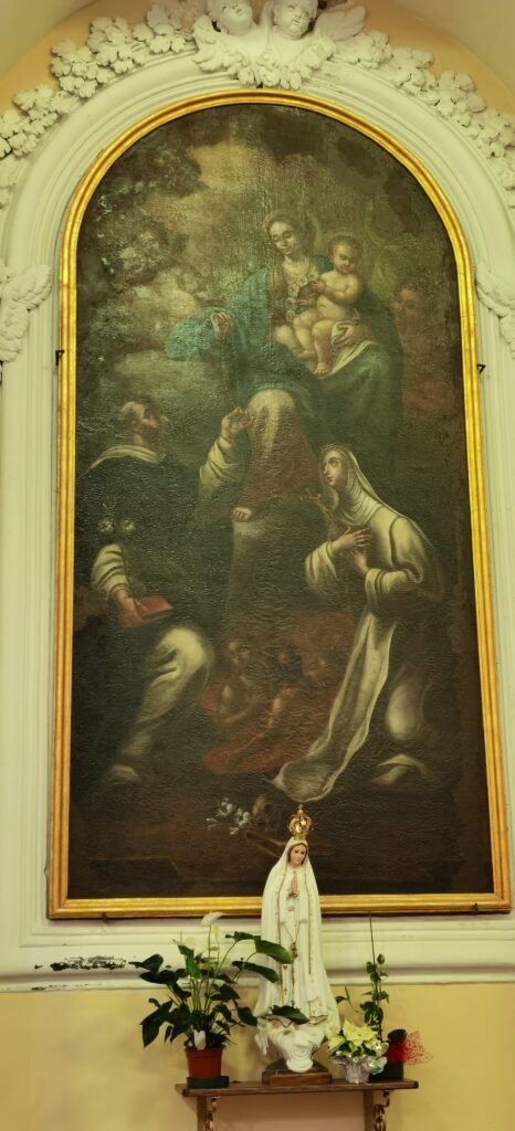 La Statua di S. Rita è collocata sempre a destra nell’altare successivo a quello di S. Pietro e della Madonna Immacolata. Essa fu acquistata dai reduci di guerra del Paese che riuscirono a ritornare vivi dal fronte dopo la prima e la Seconda guerra mondiale. Infatti, proprio nella parte sottostante all’altare sono scalfiti nel marmo i nomi di alcuni dei soldati che ringraziavano la “santa dei casi impossibili” per aver loro concesso di ritornare a casa e poter riabbracciare i propri cari.