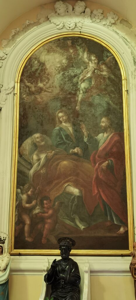Nelle pareti della Chiesa sono presenti tre dipinti che risalgono molto probabilmente al ‘700, si crede che siano stati realizzati, secondo il Falcone, da un pittore siciliano, un tal Russo di Barcellona. Essi ritraggono rispettivamente “Il transito di Giuseppe”, “La Natività” e la “Madonna del Rosario”; era presente un ulteriore affresco nella parete in cui adesso è collocata la Statua riguardante la Crocifissione di Cristo, risalente invece al Seicento, che però è andato perduto. Questi tre dipinti si vanno ad aggiungere all’”Annunciazione” che si trova sopra l’altare principale, nella parete sud dell’Edificio.
