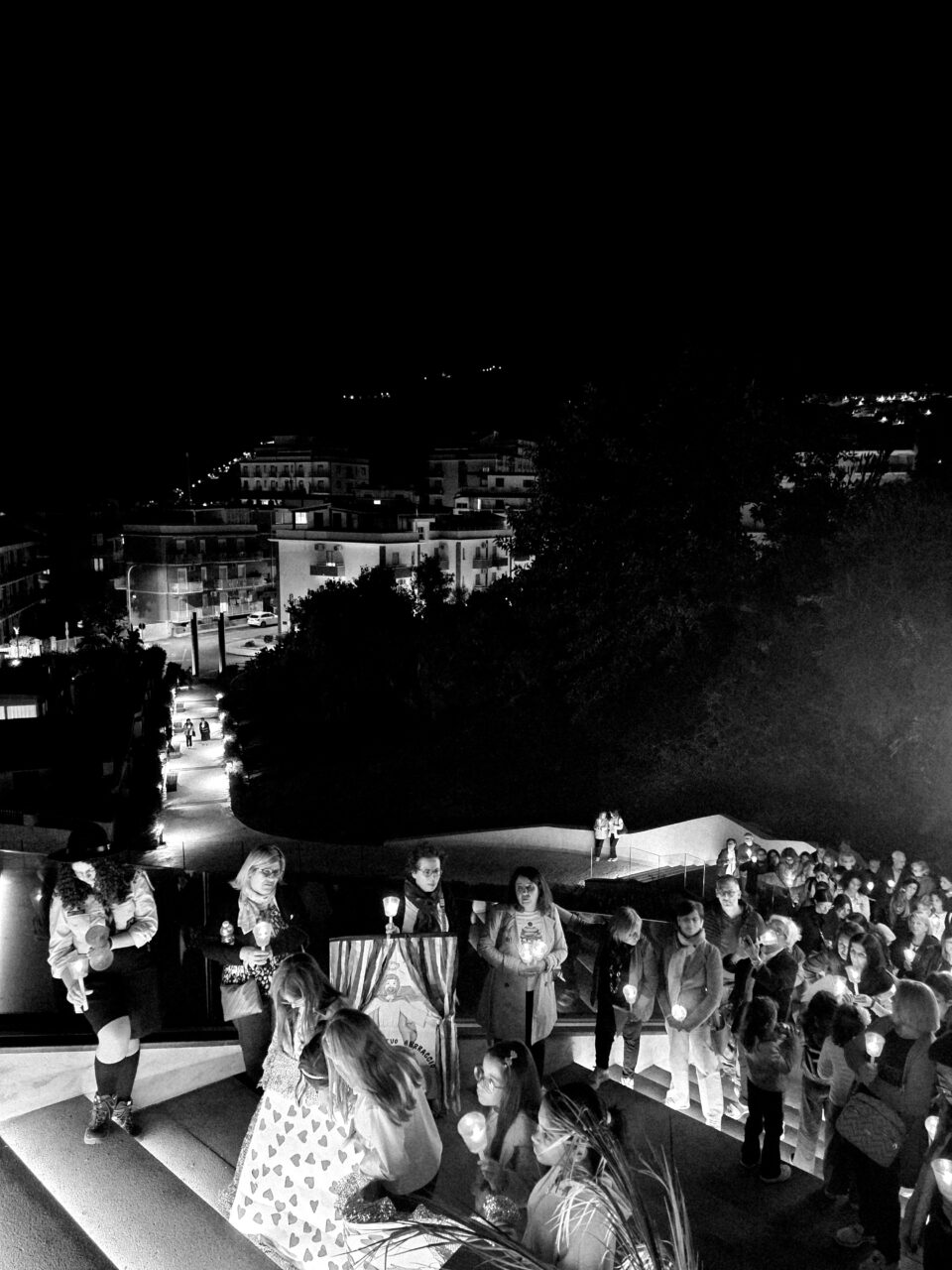 Giunti alla cima della Scala della Luce, punto scelto per la sua collocazione suggestiva e come luogo simbolo, il parroco ha elevato la preghiera di affidamento della città alla Madonna.
