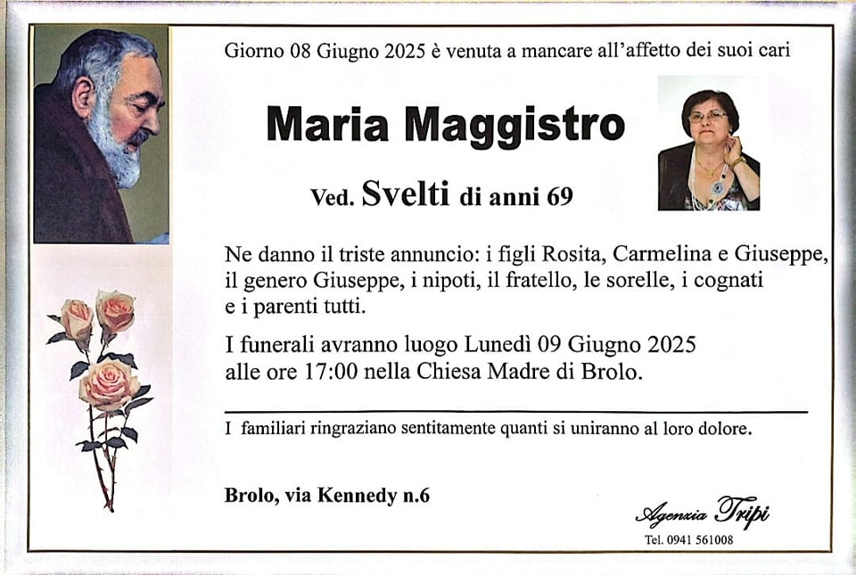 Oggi il Signore ha chiamato a sé Maria Maggistro. Dio, che è fonte della vita e destino ultimo dell’uomo, custodisca la sua anima e conforti i suoi familiari. La sua anima e le anime di tutti i fedeli defunti, per la misericordia di Dio, riposino in pace. Amen.