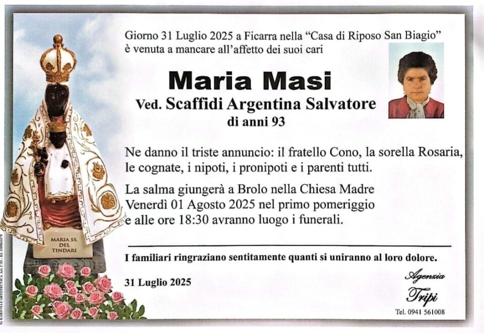 Oggi il Signore ha chiamato a sé Maria Masi. Dio, che è fonte della vita e destino ultimo dell’uomo, custodisca la sua anima e conforti i suoi familiari. La sua anima e le anime di tutti i fedeli defunti, per la misericordia di Dio, riposino in pace. Amen